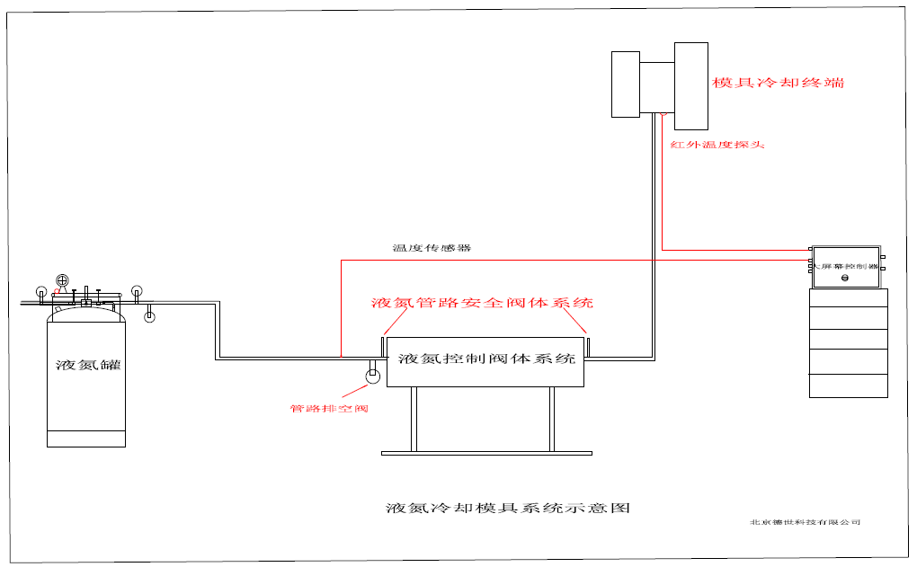 控制系統(tǒng)主要由液氮輸送管路、控制閥體、溫度監(jiān)控、自動旁通、安全系統(tǒng)等一整套系統(tǒng)整合的自動控制系統(tǒng)組成。液氮輸送管路負責從液氮罐體輸送液氮到控制系統(tǒng)閥體,再輸送到鋁模具端液氮套裝內(nèi)部。整體系統(tǒng)運行由控制系統(tǒng)來運作。